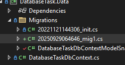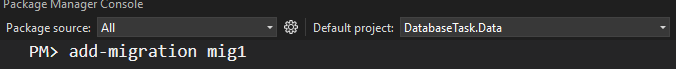 nüüd kirjutan package manager consooli add-migration ja migratiooni nime ja veel tuleb vahetada projecti nime, et see oleks databaseTask.Data