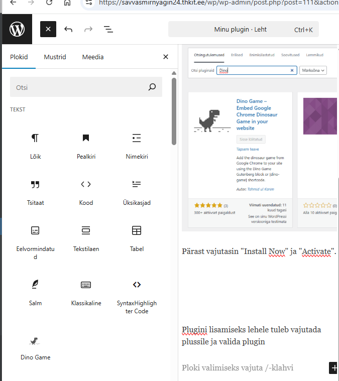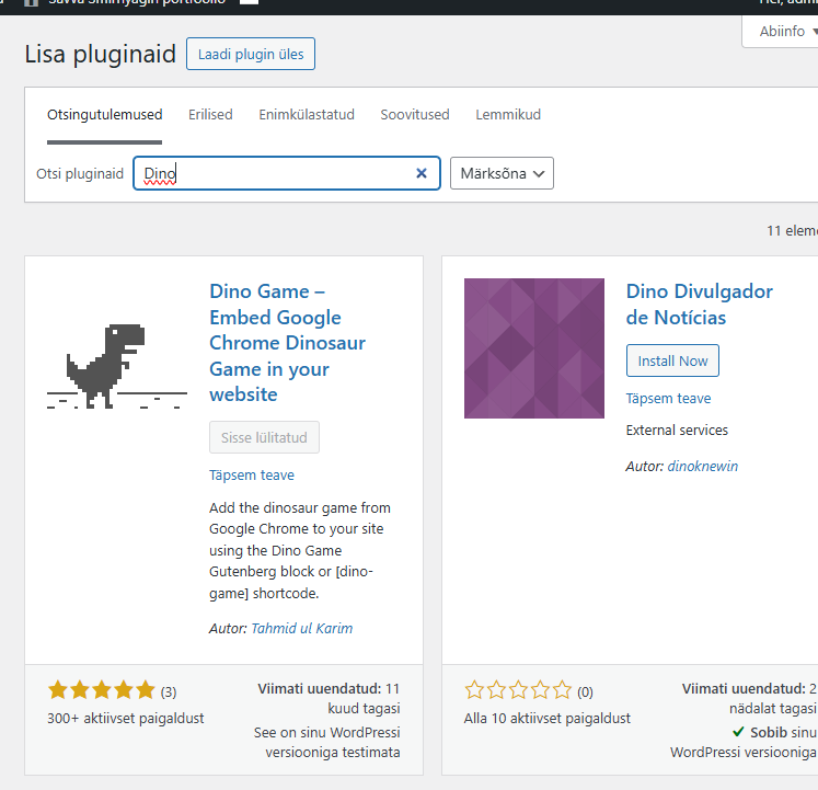 Seadistamiseks vajutasin add plugin ja kirjutasin otsingusse “Dino”